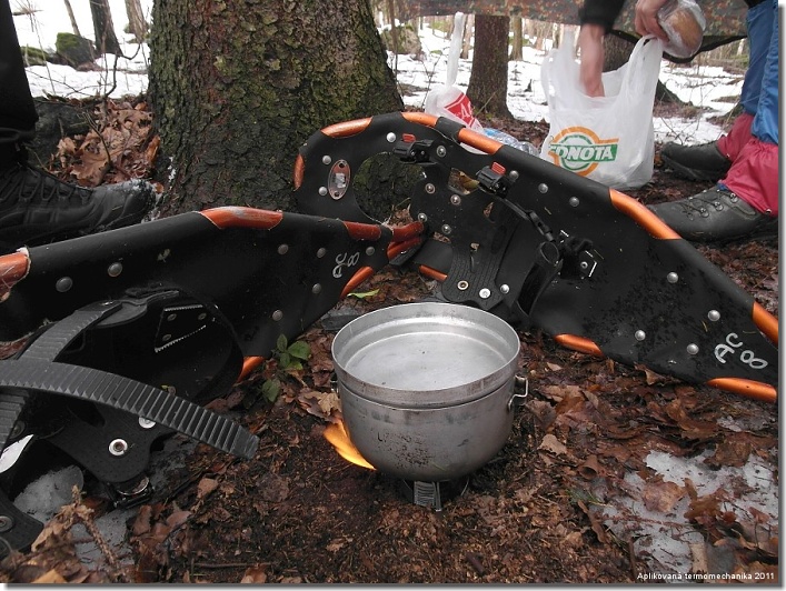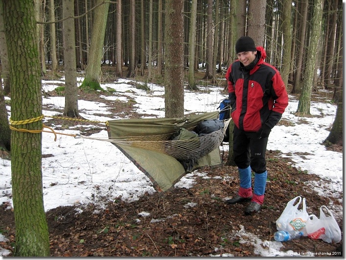 Po celkem snadném pochodu turistickými cestami nás čekal obtížný úsek průsekem podél státní hranice. Překonali jsme několik rozvodněných potoků (v celé ČR panovala obleva a bylo jistě alespoň 5 stupňů nad nulou) a kolem půl dvanácté v noci dorazili k plánovanému místu noclehu, Bílé skále.